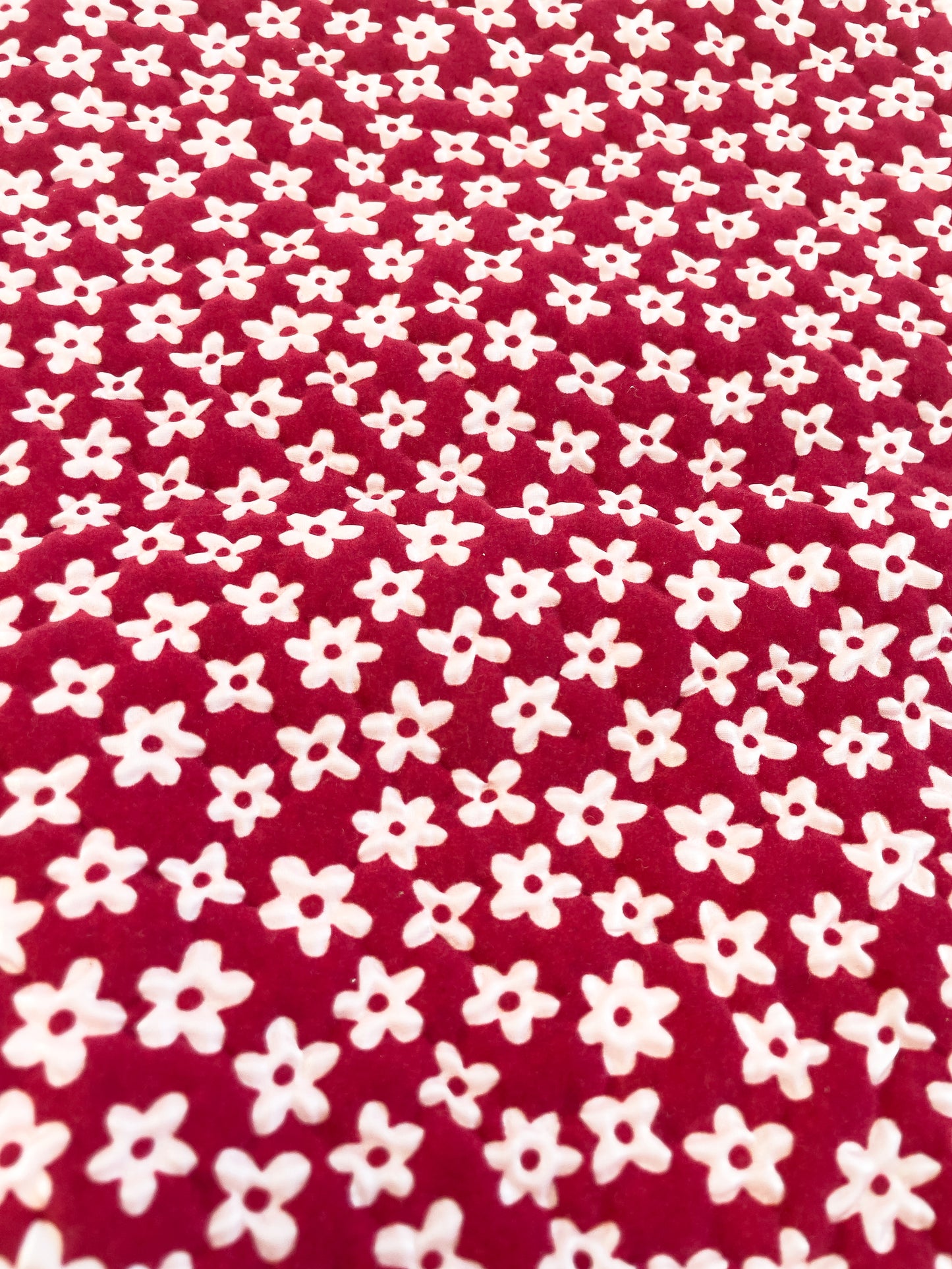日本の昭和初期くらいに日本の女性が着ていた服の小花柄を、全面にフロッキープリントを施し、立体的に表現しました。