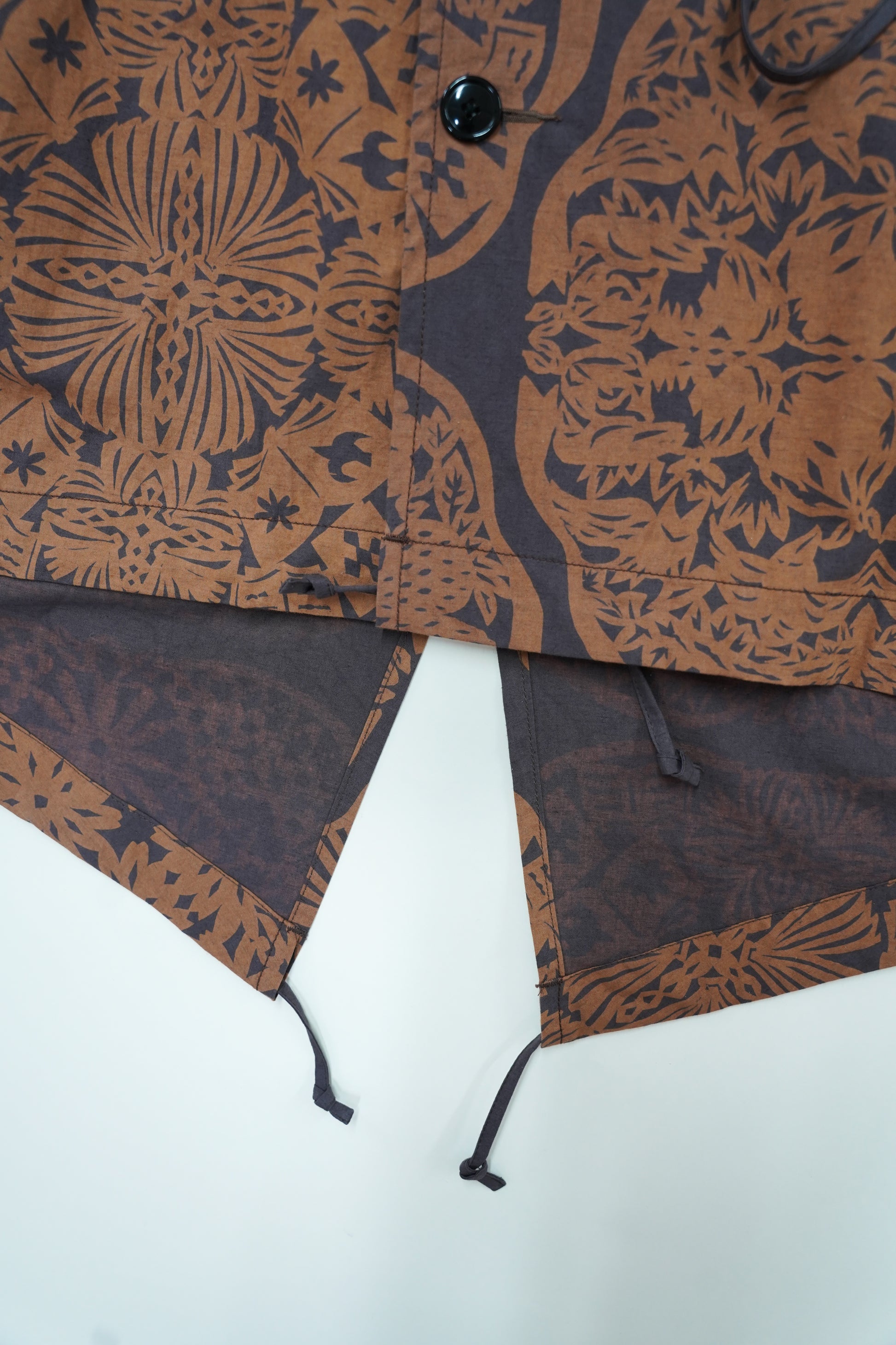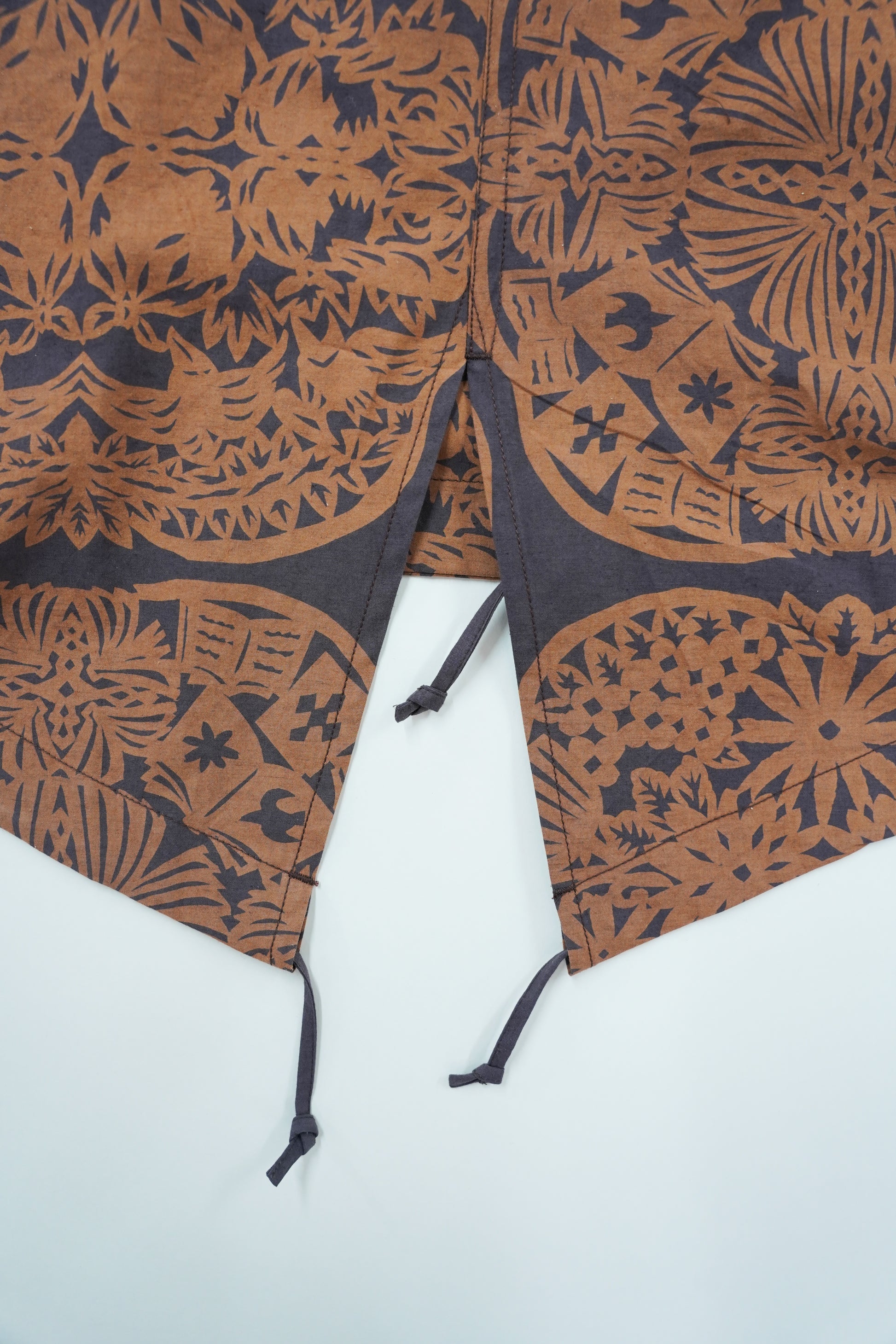 素材は綿麻で、ナチュラルなシワ感が特徴。量産分はプリント手法の都合上、柄部分の色味がサンプルと異なる場合があります。