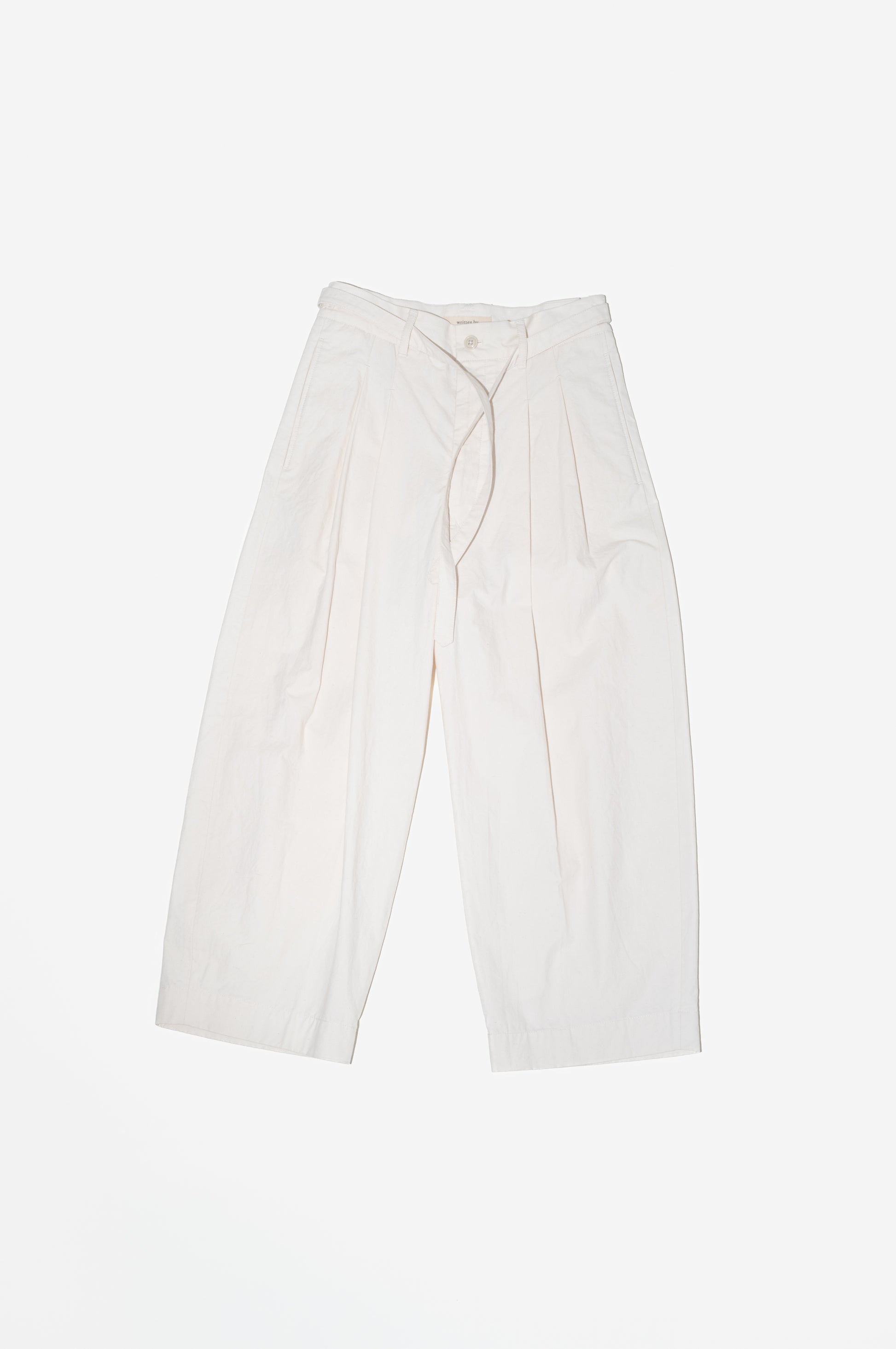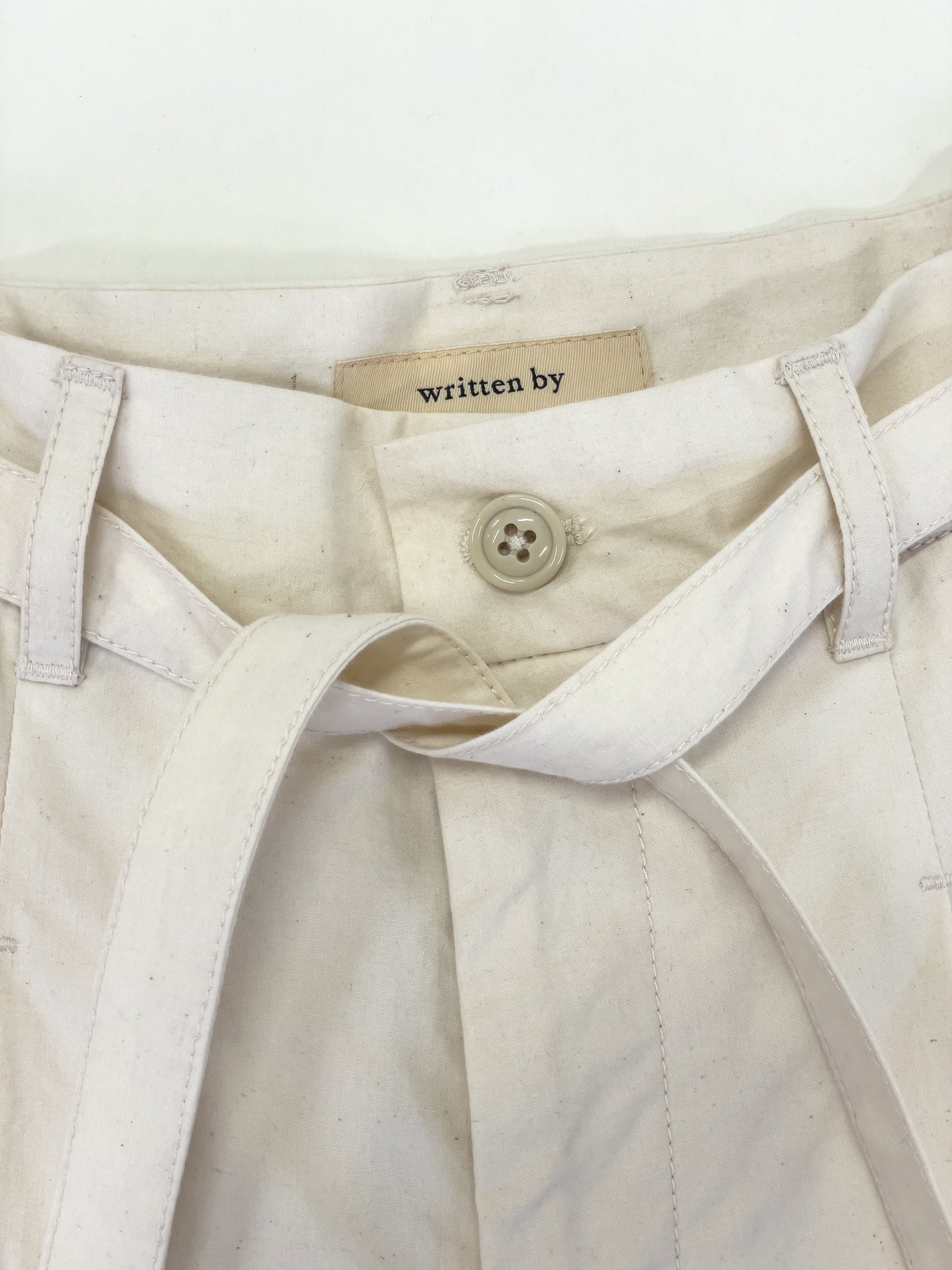 ウエストに入れた2本のタックが立体感とゆとりを生み、ヒップから腿まわりにかけては程よく分量を持たせ、裾に向かってテーパードするラインで美しいシルエットを描きます。