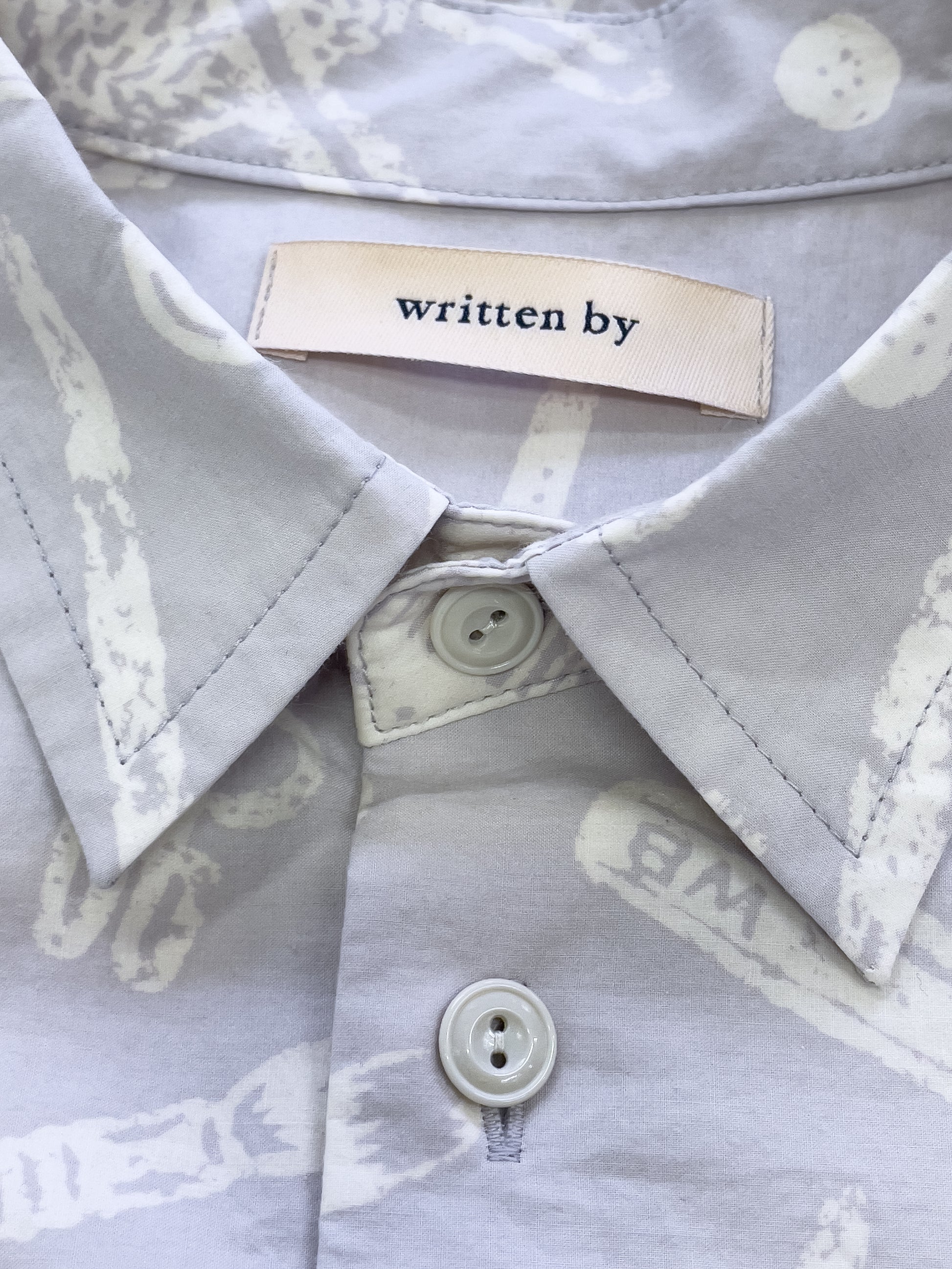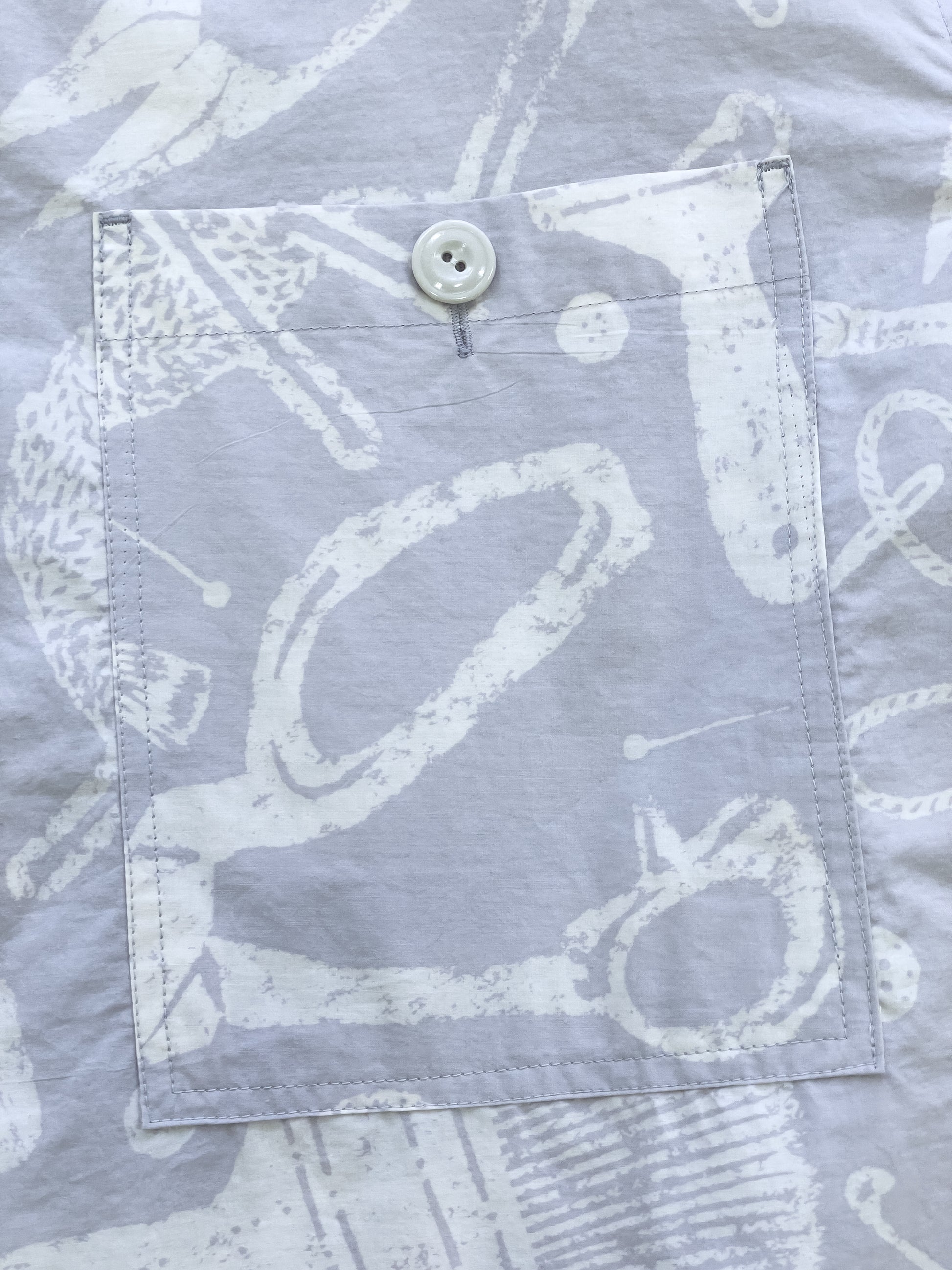 "write, draw & sew" に使われる道具類が描かれています。抜染でプリントすることで、より生地に馴染み奥行きを感じさせる仕上がりに。胸には大きめのポケットつき。